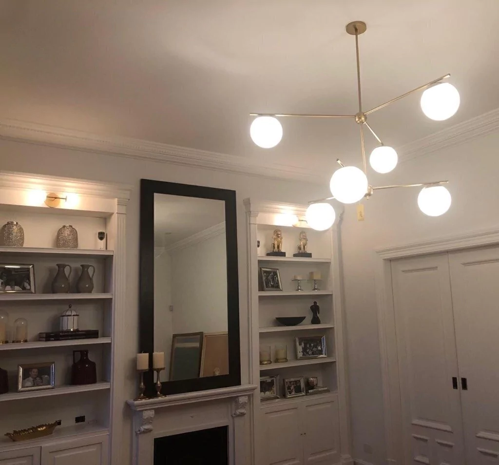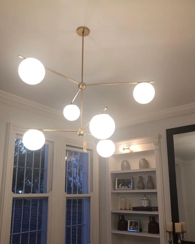DESCRIPCIÓN: Lámpara realizada en hierro con capacidad para 6 luces. Con tulipas de vidrio opal y floron.