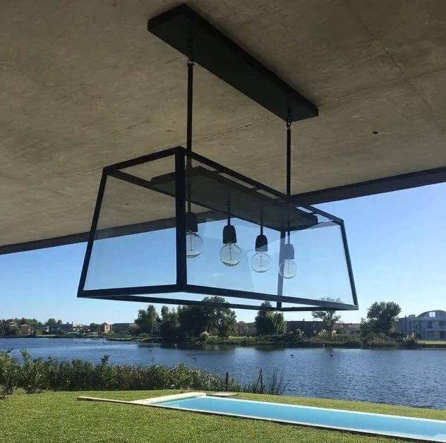 DESCRIPCIÓN: Lámpara colgante apta para 4 luces, realizada en hierro y vidrios. Con plafon rectangular. Se puede colgar con caños rigidos o con cadena, indicar altura ya que se realiza a medida y a pedido.