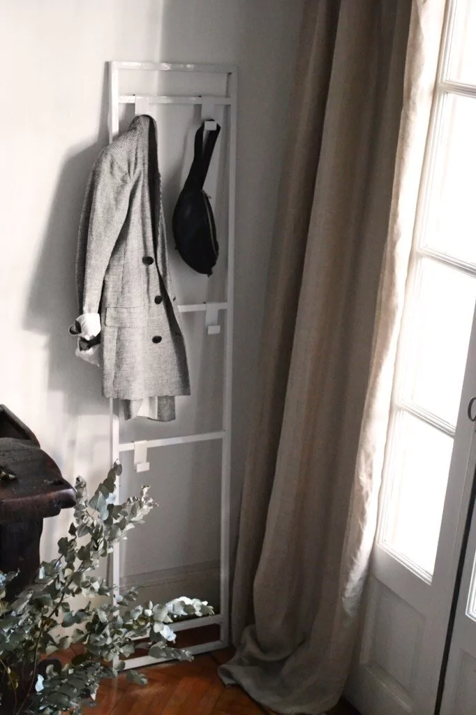 DESCRIPCIÓN: Perchero para apoyar a la pared en hierro pintado a fuego. Incluye 5 ganchos movibles para colgar.