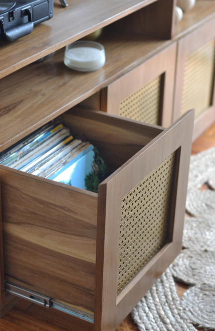 Terminación: Madera petiribí enchapada e hidrolaqueada y frentes de puertas con chapa estilo rattan en color dorado mate y aperturas con buña escondida.